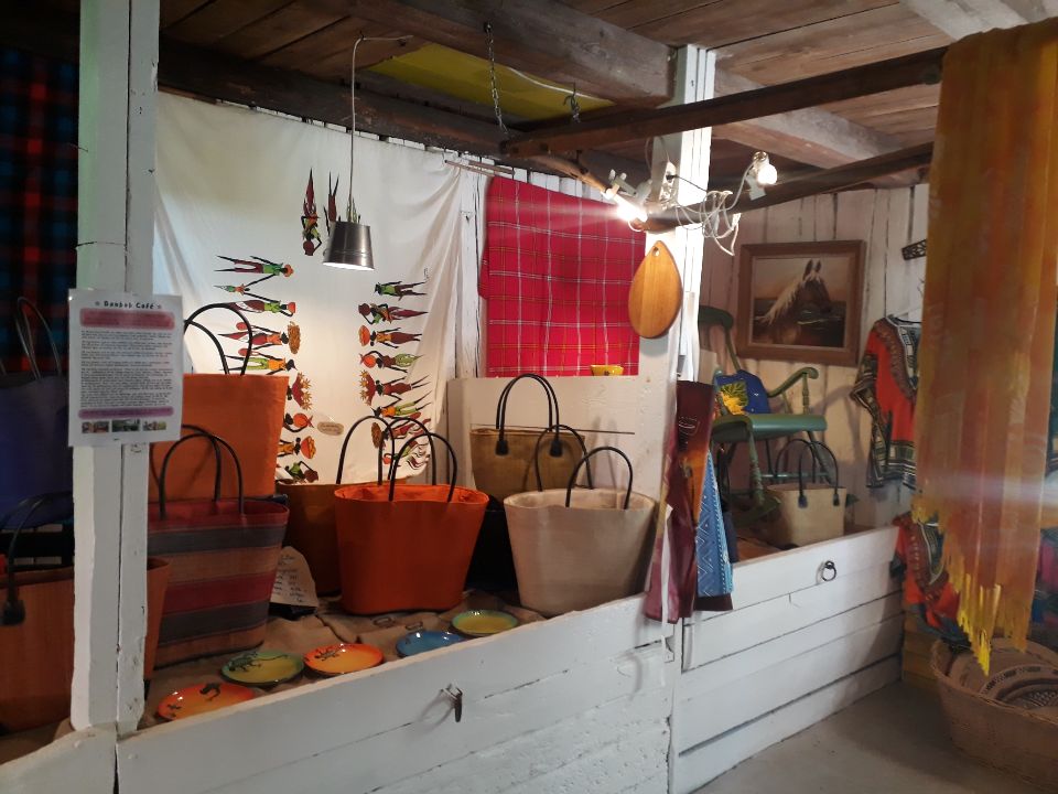 I stallets vida foderbås finns nu vackert flätade korgar av gräs. Korgväskor av sisal och hattar. De är gjorda av hantverkare i östra och södra Afrika - Kenya, Tanzania, Madagaskar, Sydafrika. Trähantverket är från hållbara skogar. Snidade kenyanska fåglar i starka färger. Träbestick av vilda olivträd med handtag gjorda av koben, med mönster och former som använts i generationer. Det finns handgjord batik, målade tyger, dukar, kuddar, förkläden. Hantverk av återvunnen metall och tråd. Vackra täljstensfigurer från Kenya och Zimbabwe - fina presenter i livets skeenden, eftersom de alltid säger mer än ord.
